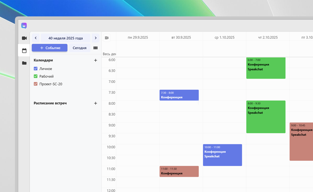 Календарь в Speakchat — это полностью самостоятельное решение. Он не требует подключения к западным облачным сервисам и работает автономно. Все данные остаются под вашим контролем, что особенно важно для компаний и команд, работающих в корпоративных сетях.