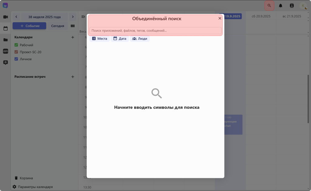 В нашем сервисе реализован единый сквозной поиск, который позволяет находить нужную информацию в том числе в календаре (участники, документы и другие данные).